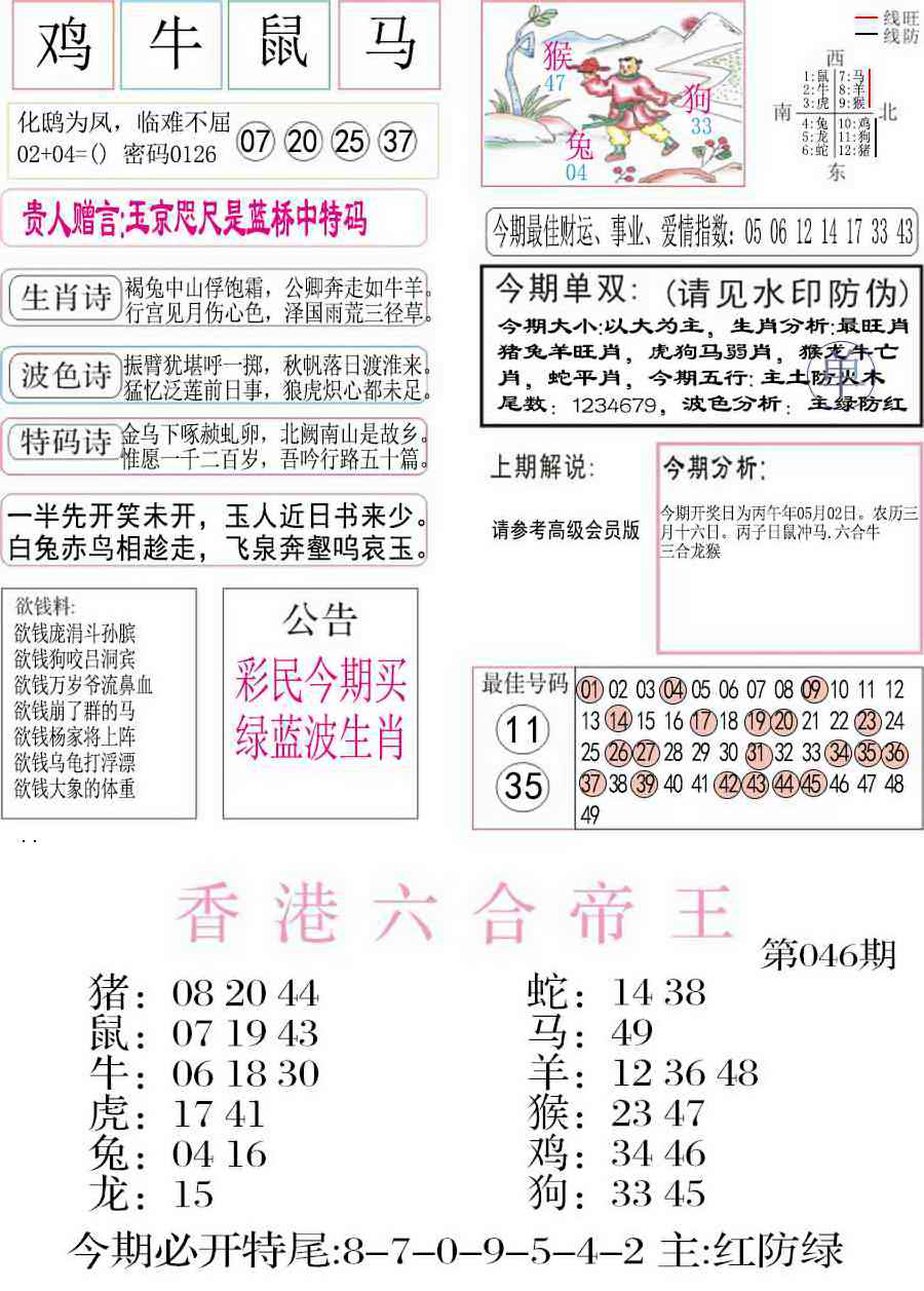 046期:彩民推荐:≮粤彩联盟≯→(博彩必备)